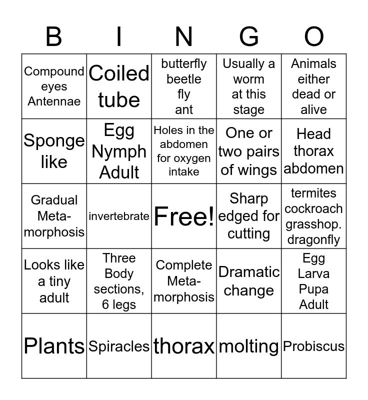This bingo card has a free space and 24 words: Three Body sections, 6 legs, Spiracles, Holes in the abdomen for oxygen intake, Plants, Animals either dead or alive, Compound eyes Antennae, Sponge like, Coiled tube, Sharp edged for cutting, Complete Meta- morphosis, One or two pairs of wings, Gradual Meta- morphosis, Dramatic change, Egg Larva Pupa Adult, Egg Nymph Adult, molting, termites cockroach grasshop. dragonfly, butterfly beetle fly ant, Head thorax abdomen, invertebrate, Probiscus, Looks like a tiny adult, Usually a worm at this stage and thorax.