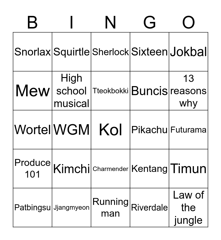 This bingo card has a free space and 24 words: Kimchi, Jjangmyeon, Tteokbokki, Patbingsu, Jokbal, Snorlax, Mew, Squirtle, Pikachu, Charmender, Buncis, Wortel, Kentang, Timun, High school musical, Riverdale, Futurama, Sherlock, 13 reasons why, WGM, Law of the jungle, Produce 101, Sixteen and Running man.
