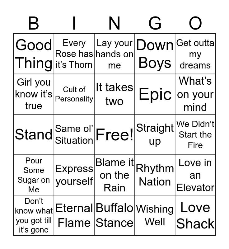 This bingo card has a free space and 34 words: Rag Doll, Wishing Well, My Prerogative, Bad Medicine, Pour Some Sugar on Me, Cult of Personality, Get outta my dreams, Don’t know what you got till it’s gone, Every Rose has it’s Thorn, Gypsy Road, It takes two, Lay your hands on me, Nothing but a good time, Simply Irresistible, Straight up, What’s on your mind, Eternal Flame, Stand, Express yourself, Rhythm Nation, Blame it on the Rain, Baby don’t forget my number, Good Thing, We Didn’t Start the Fire, Buffalo Stance, Love Shack, Down Boys, Dr. Feelgood, Epic, Girl you know it’s true, Heaven, Same ol’ Situation, Love in an Elevator and Roam.