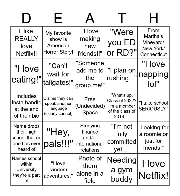 This bingo card has a free space and 24 words: "Hey, pals!!!", "I love random adventures.", "Someone add me to the group.me!", Names school within University they're a part of, From Martha's Vineyard/ New York/ Connecticut, I, like, REALLY love Netflix!!, "I love eating!", My favorite show is American Horror Story!, "What's up, Class of 2022? I'm a member of the class of 2018...", Studying finance and/or international relations, "I plan on rushing...", Includes Insta handle at the end of their bio, "I'm not fully committed yet...", "Looking for a roomie or just for friends.", "Can't wait for tailgates!", Needing a gym buddy, "I take school SERIOUSLY.", "I love making new friends!!", "I love napping lol", Claims they can speak another language (clearly cannot), I love Netflix!, Name drops their high school that no one has ever heard of, "Were you ED or RD?" and Photo of them alone in a field.