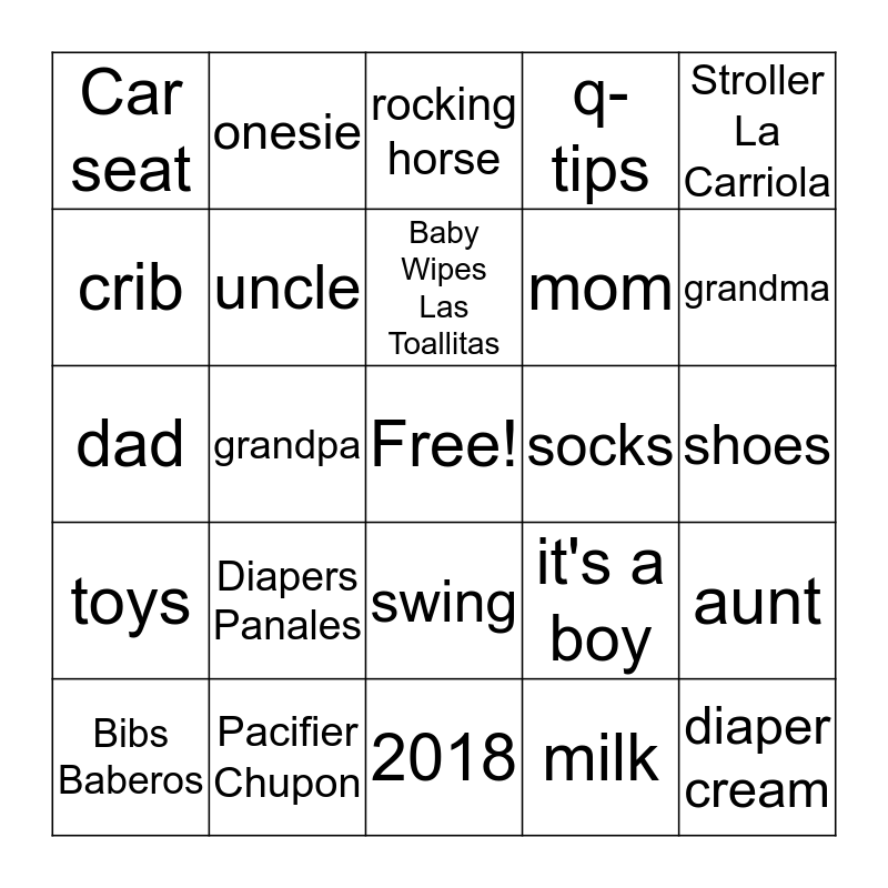 This bingo card has a free space and 24 words: Diapers Panales, Pacifier Chupon, Baby Wipes Las Toallitas, Bibs Baberos, Stroller La Carriola, Car seat, crib, onesie, socks, swing, mom, dad, it's a boy, aunt, uncle, milk, shoes, rocking horse, grandma, grandpa, diaper cream, toys, q-tips and 2018.
