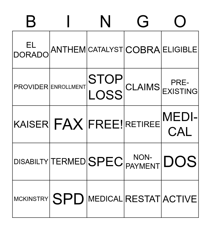 This bingo card has a free space and 24 words: TERMED, SPD, STOP LOSS, MCKINSTRY, ELIGIBLE, EL DORADO, PROVIDER, ANTHEM, RETIREE, SPEC, CLAIMS, KAISER, NON-PAYMENT, DOS, ENROLLMENT, RESTAT, MEDI-CAL, CATALYST, PRE-EXISTING, FAX, ACTIVE, DISABILTY, COBRA and MEDICAL.