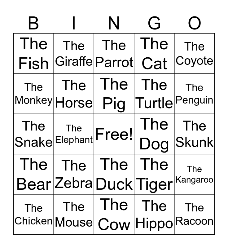 This bingo card has a free space and 37 words: The Whale, The Buffalo, The Donkey, The Horse, The Kangaroo, The Zebra, The Pig, The Rabbit, The Coyote, The Dolphin, The Elephant, The Cat, The Racoon, The Skunk, The Monkey, The Bear, The Bird, The Parrot, The Duck, The Dog, The Fish, The Penguin, The Chicken, The Cow, The Gorilla, The Hippo, The Giraffe, The Alligator, The Lion, The Wolf, The Frog, The Mouse, The Snake, The Shark, The Tiger, The Turtle and The Bull.