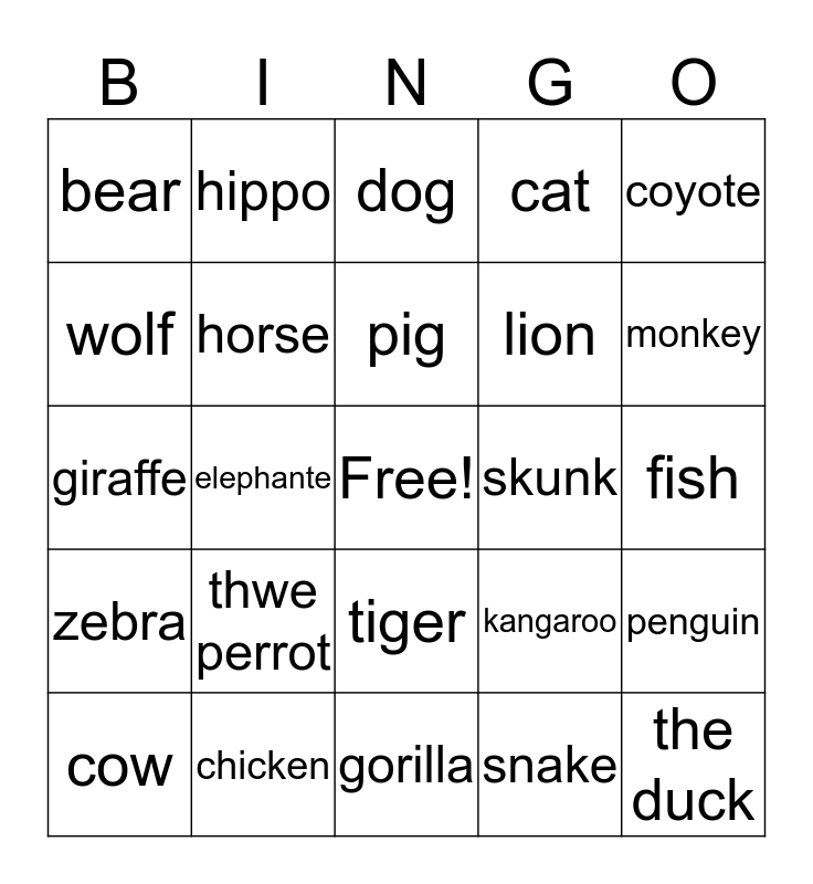This bingo card has a free space and 36 words: Whale, buffilo, donkey, horse, kangaroo, zebra, pig, rabbit, coyote, dolphin, elephante, cat, racoon, skunk, monkey, bear, the bird, thwe perrot, the duck, dog, fish, penguin, chicken, cow, gorilla, hippo, giraffe, alligatora, lion, wolf, frog, mouse, snake, tiger, turtle and the bull.