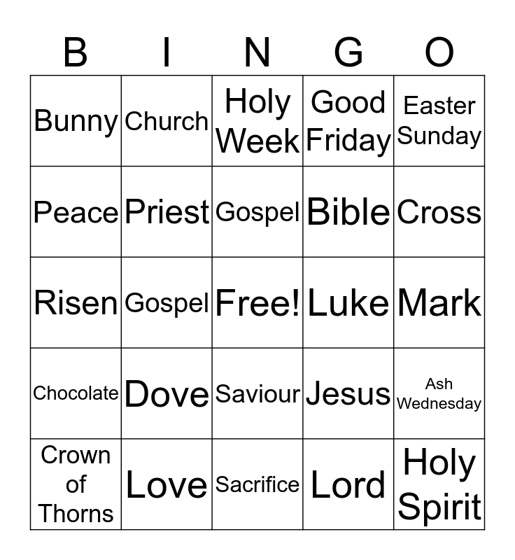 This bingo card has a free space and 24 words: Dove, Love, Gospel, Crown of Thorns, Easter Sunday, Bunny, Peace, Church, Luke, Saviour, Bible, Risen, Jesus, Ash Wednesday, Priest, Lord, Mark, Holy Week, Cross, Gospel, Holy Spirit, Chocolate, Good Friday and Sacrifice.