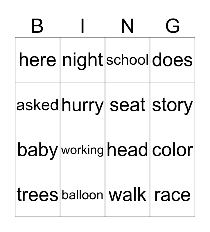 This bingo card has 16 words: balloon, color, school, here, baby, night, head, walk, asked, hurry, trees, does, working, story, seat and race.