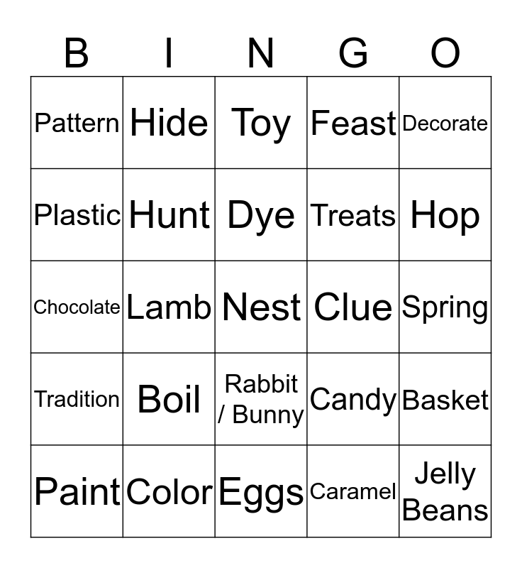 This bingo card has 25 words: Boil, Eggs, Dye, Paint, Decorate, Pattern, Plastic, Hide, Clue, Rabbit / Bunny, Treats, Chocolate, Candy, Basket, Hunt, Jelly Beans, Spring, Toy, Hop, Lamb, Nest, Color, Tradition, Feast and Caramel.