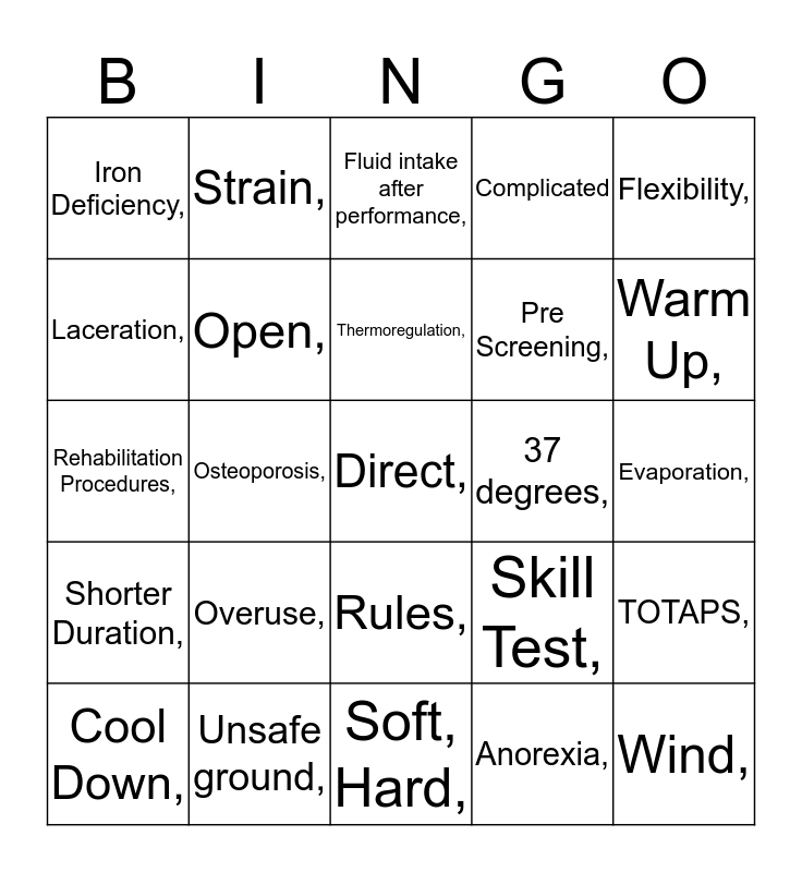 This bingo card has 48 words: Free!, Direct,, Indirect,, Soft, Hard,, Overuse,, Sprain,, Strain,, Skin Abrasion,, Laceration,, Acute Stage,, Open,, Complicated, TOTAPS,, Skill Test,, Epilepsy,, Stress Fracture,, Thermoregulation,, 37 degrees,, low intensity,, Flexibility,, Osteoporosis,, Anorexia,, Iron Deficiency,, Pre Screening,, Skill and Technique,, Warm Up,, Cool Down,, Sport Policies,, Rules,, Shorter Duration,, Gender,, Helmet,, Netta,, Protective Equipment,, Unsafe ground,, Convection,, Conduction,, Evaporation,, Radiation,, Hypothermia,, Hyperthermia,, Wind,, Fluid intake after performance,, Bandaging,, Rehabilitation Procedures,, Conditioning, Ankle,, Progressive Mobilisation, and Ballistic.