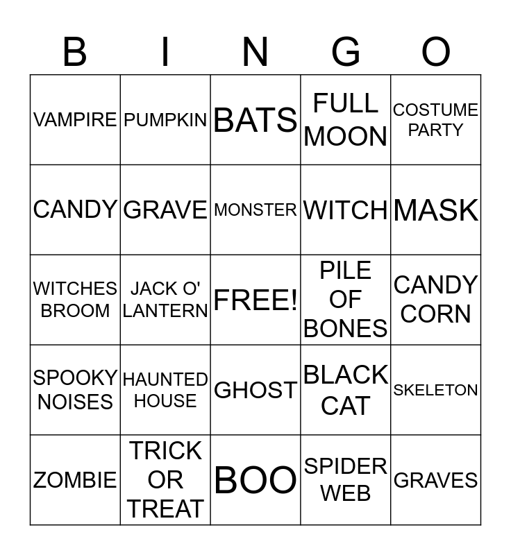 This bingo card has a free space and 26 words: GHOST, SPIDER WEB, MONSTER, TRICK OR TREAT, COSTUME PARTY, VAMPIRE, CANDY, PUMPKIN, CANDY CORN, BLACK CAT, WITCH, WITCHES BROOM, SKELETON, ZOMBIE, JACK O' LANTERN, MUMMY, FULL MOON, SPOOKY NOISES, BATS, GRAVES, MASK, BOO, PILE OF BONES, HAUNTED HOUSE, GRAVE and COFFIN.