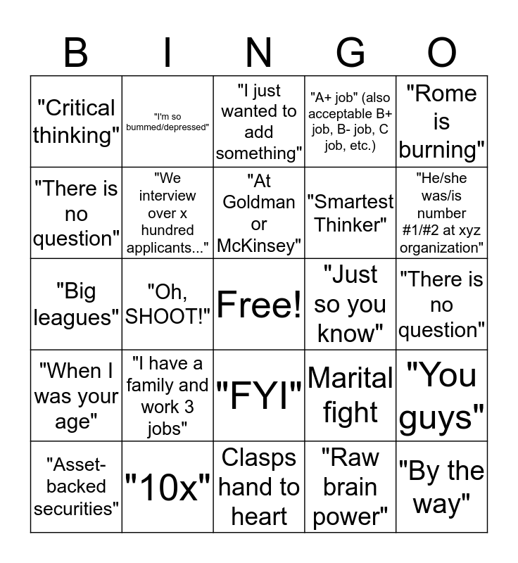 This bingo card has a free space and 24 words: "I have a family and work 3 jobs", "10x", "At Goldman or McKinsey", "Asset-backed securities", "Rome is burning", "Critical thinking", "There is no question", "I'm so bummed/depressed", "Just so you know", "FYI", "Smartest Thinker", "Big leagues", Marital fight, "You guys", "We interview over x hundred applicants...", "Raw brain power", "There is no question", "I just wanted to add something", "He/she was/is number #1/#2 at xyz organization", "Oh, SHOOT!", "By the way", "When I was your age", "A+ job" (also acceptable B+ job, B- job, C job, etc.) and Clasps hand to heart.