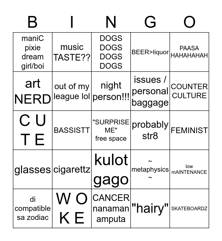 This bingo card has a free space and 24 words: cigarettz, W O K E, night person!!!, di compatible sa zodiac, PAASA HAHAHAHAH, maniC pixie dream girl/boi, art NERD, music TASTE??, probably str8, kulot gago, issues / personal baggage, C U T E, ~ metaphysics ~, low mAINTENANCE, out of my league lol, "hairy", FEMINIST, DOGS DOGS DOGS DOGS, COUNTER CULTURE, BASSISTT, SKATEBOARDZ, glasses, BEER>liquor and CANCER nanaman amputa.