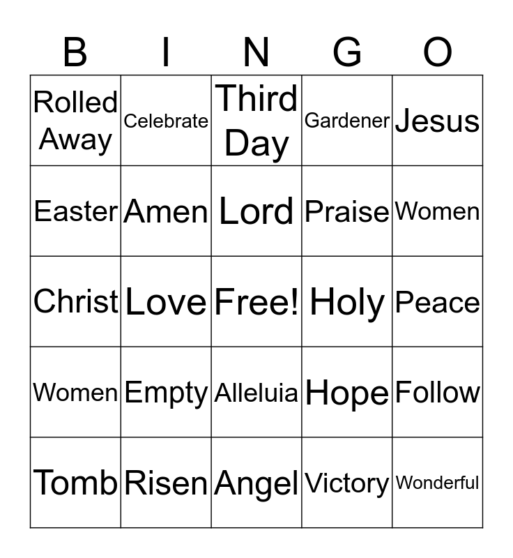 This bingo card has a free space and 24 words: Empty, Risen, Lord, Tomb, Jesus, Rolled Away, Easter, Celebrate, Holy, Alleluia, Praise, Christ, Hope, Follow, Amen, Victory, Peace, Third Day, Women, Love, Wonderful, Women, Gardener and Angel.