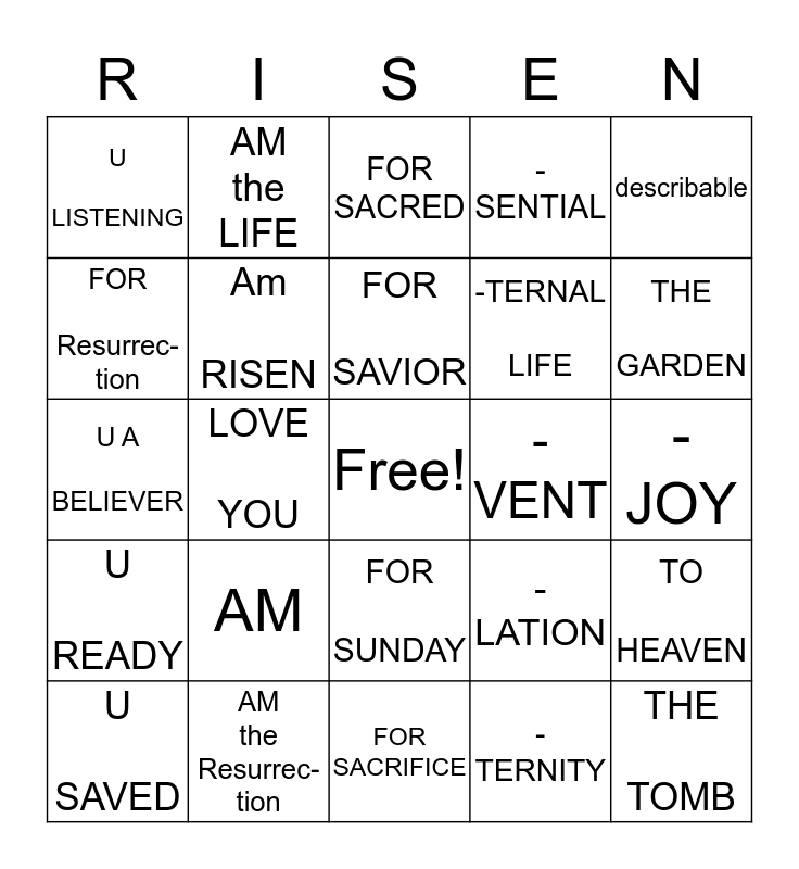 This bingo card has a free space and 24 words: U SAVED, AM, FOR SAVIOR, -TERNITY, describable, U LISTENING, AM the LIFE, FOR SACRED, -VENT, - JOY, U A BELIEVER, Am RISEN, -LATION, TO HEAVEN, FOR Resurrec-tion, AM the Resurrec-tion, FOR SACRIFICE, -SENTIAL, THE GARDEN, U READY, LOVE YOU, FOR SUNDAY, -TERNAL LIFE and THE TOMB.