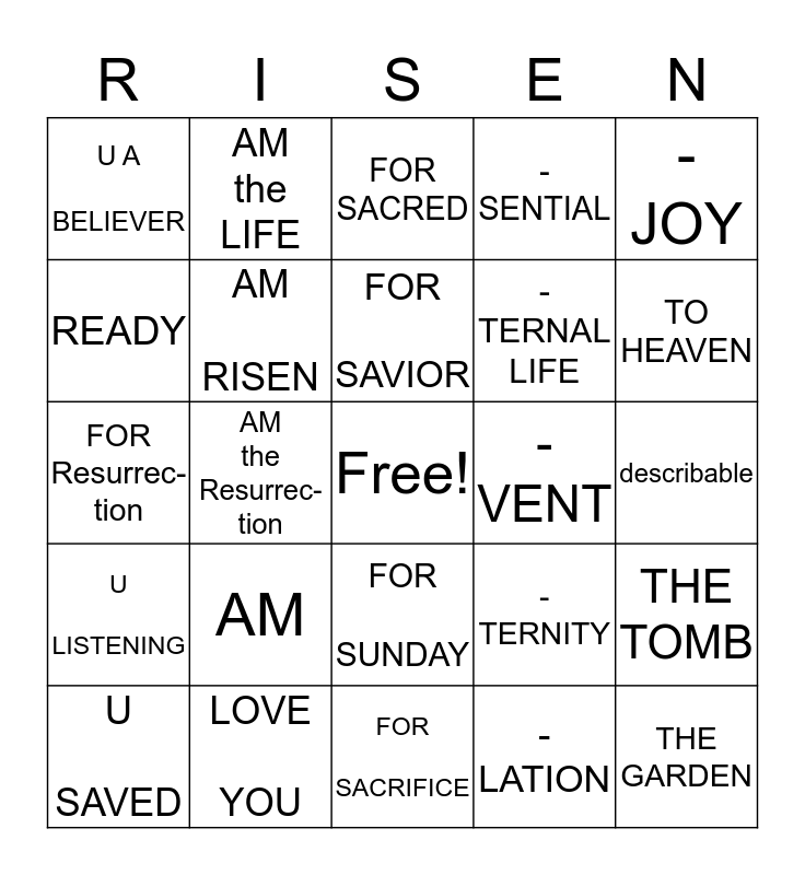 This bingo card has a free space and 24 words: U SAVED, AM, FOR SAVIOR, -LATION, - JOY, U A BELIEVER, AM the LIFE, FOR SACRED, -VENT, describable, FOR Resurrec-tion, AM RISEN, -TERNITY, THE TOMB, READY, LOVE YOU, FOR SACRIFICE, -SENTIAL, TO HEAVEN, U LISTENING, AM the Resurrec-tion, FOR SUNDAY, -TERNAL LIFE and THE GARDEN.