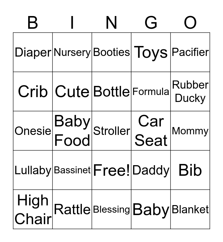 This bingo card has 26 words: Free!, Baby, Bottle, Rattle, Pacifier, Diaper, Crib, Nursery, Mommy, Daddy, Formula, Onesie, Bib, High Chair, Baby Food, Teddy Bear, Toys, Lullaby, Booties, Stroller, Rubber Ducky, Blessing, Car Seat, Bassinet, Cute and Blanket.