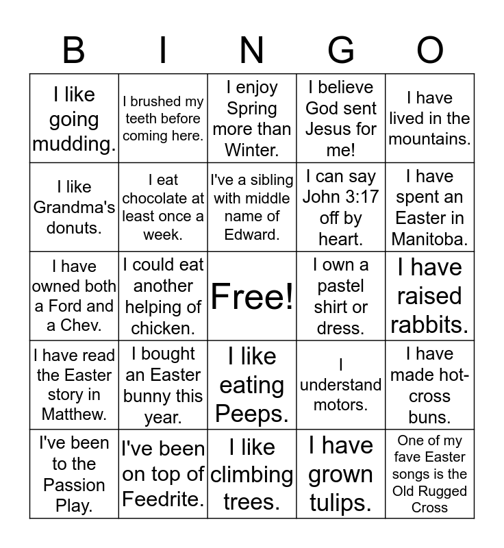 This bingo card has a free space and 24 words: I've been to the Passion Play., I bought an Easter bunny this year., I've a sibling with middle name of Edward., I have grown tulips., I have lived in the mountains., I like going mudding., I brushed my teeth before coming here., I enjoy Spring more than Winter., I own a pastel shirt or dress., I have raised rabbits., I have owned both a Ford and a Chev., I eat chocolate at least once a week., I understand motors., I have made hot-cross buns., I like Grandma's donuts., I've been on top of Feedrite., I like climbing trees., I believe God sent Jesus for me!, I have spent an Easter in Manitoba., I have read the Easter story in Matthew., I could eat another helping of chicken., I like eating Peeps., I can say John 3:17 off by heart. and One of my fave Easter songs is the Old Rugged Cross.