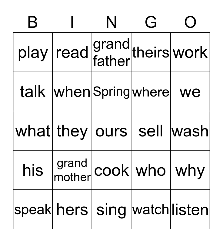 This bingo card has 25 words: grand mother, sing, Spring, speak, work, play, talk, read, sell, cook, where, what, who, why, when, listen, wash, grand father, we, they, ours, hers, his, theirs and watch.