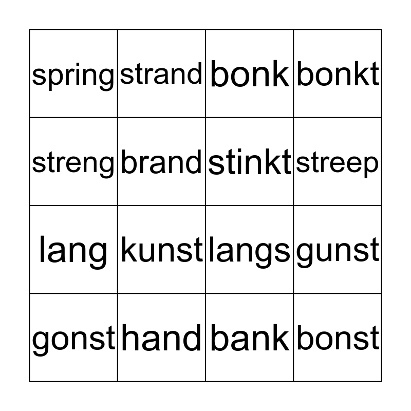 This bingo card has 24 words: straal, streel, streep, strop, streng, spring, brand, strand, hand, hang, lang, langs, strikt, stikt, stinkt, stank, bank, bonk, kunst, gunst, gonst, bonst, bonkt and bonk.