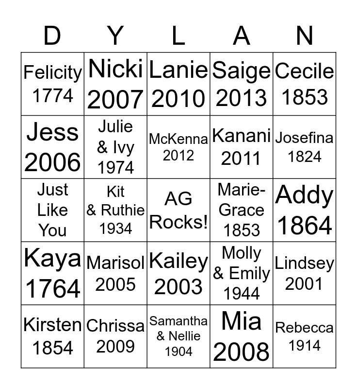 This bingo card has a free space and 24 words: Marisol 2005, Chrissa 2009, McKenna 2012, Kirsten 1854, Cecile 1853, Felicity 1774, Jess 2006, Nicki 2007, Marie- Grace 1853, Kailey 2003, Kanani 2011, Just Like You, Molly & Emily 1944, Lindsey 2001, Julie & Ivy 1974, Mia 2008, Addy 1864, Lanie 2010, Josefina 1824, Kit & Ruthie 1934, Rebecca 1914, Kaya 1764, Saige 2013 and Samantha & Nellie 1904.