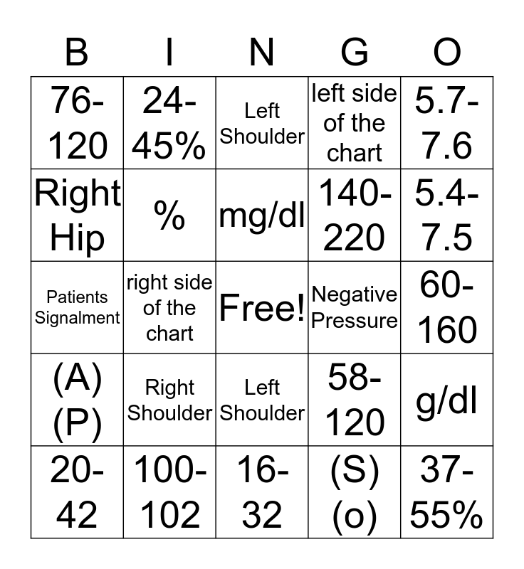This bingo card has a free space and 24 words: Right Shoulder, 100-102, mg/dl, 20-42, 5.7-7.6, 76-120, Right Hip, 24-45%, Negative Pressure, Left Shoulder, 140-220, Patients Signalment, 58-120, g/dl, %, (S) (o), 60-160, Left Shoulder, 5.4-7.5, right side of the chart, 37-55%, (A) (P), left side of the chart and 16-32.