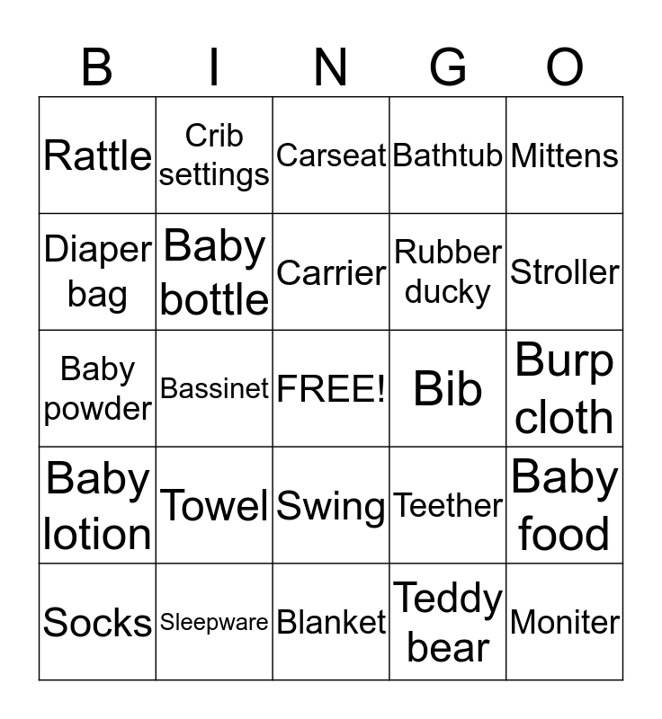 This bingo card has a free space and 24 words: Towel, Sleepware, Carrier, Socks, Mittens, Rattle, Diaper bag, Crib settings, Bib, Swing, Rubber ducky, Baby powder, Teether, Baby food, Baby bottle, Teddy bear, Burp cloth, Carseat, Stroller, Bassinet, Moniter, Baby lotion, Bathtub and Blanket.