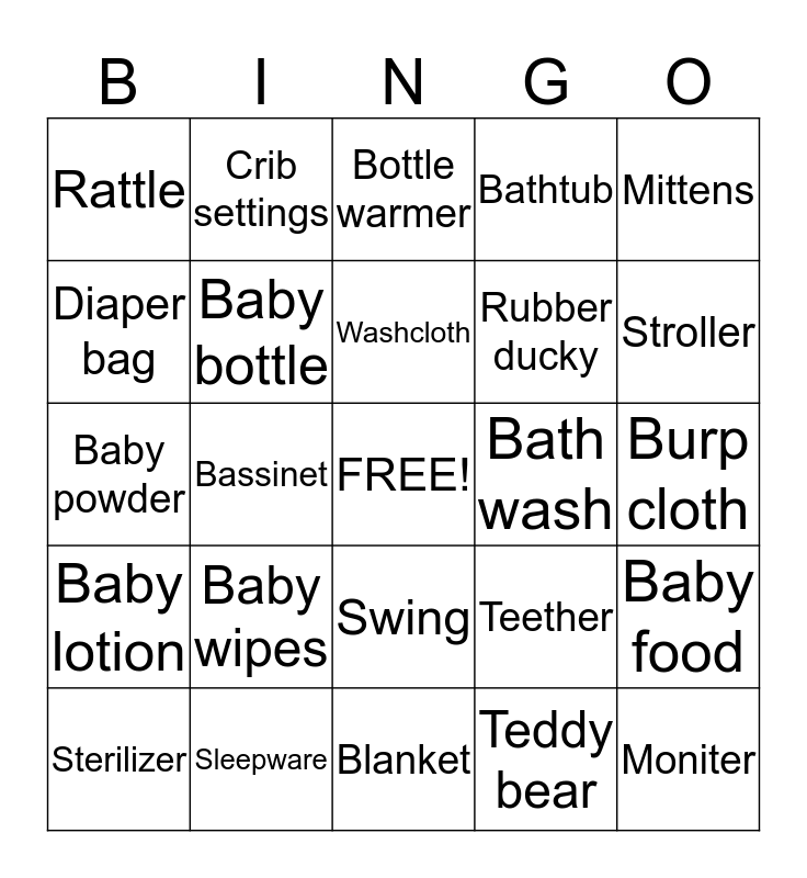 This bingo card has a free space and 24 words: Baby wipes, Sleepware, Washcloth, Sterilizer, Mittens, Rattle, Diaper bag, Crib settings, Bath wash, Swing, Rubber ducky, Baby powder, Teether, Baby food, Baby bottle, Teddy bear, Burp cloth, Bottle warmer, Stroller, Bassinet, Moniter, Baby lotion, Bathtub and Blanket.
