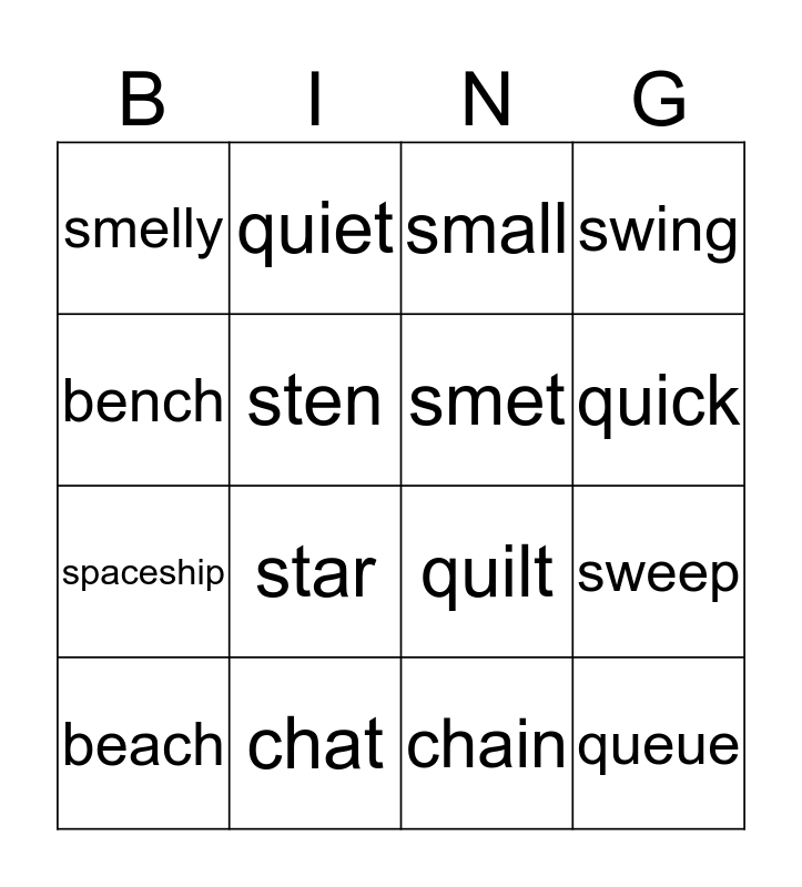 This bingo card has 16 words: chat, sweep, small, smelly, spaceship, quiet, quilt, chain, bench, sten, beach, swing, star, quick, smet and queue.