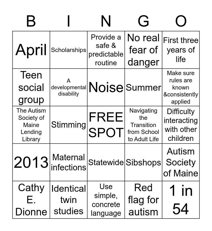 This bingo card has a free space and 24 words: Maternal infections, Identical twin studies, Noise, Cathy E. Dionne, First three years of life, April, Teen social group, Scholarships, Navigating the Transition from School to Adult Life, Statewide, Summer, The Autism Society of Maine Lending Library, Sibshops, Autism Society of Maine, A developmental disability, Red flag for autism, Difficulty interacting with other children, Provide a safe & predictable routine, Make sure rules are known &consistently applied, Stimming, 1 in 54, 2013, No real fear of danger and Use simple, concrete language.