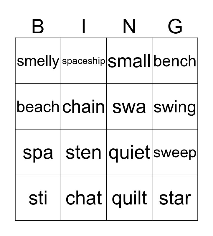 This bingo card has 16 words: chat, sweep, small, smelly, spa, spaceship, quiet, quilt, beach, chain, sti, bench, sten, swing, swa and star.