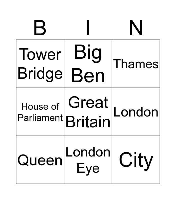 This bingo card has a free space and 8 words: London, Thames, Big Ben, Queen, Tower Bridge, City, House of Parliament and London Eye.