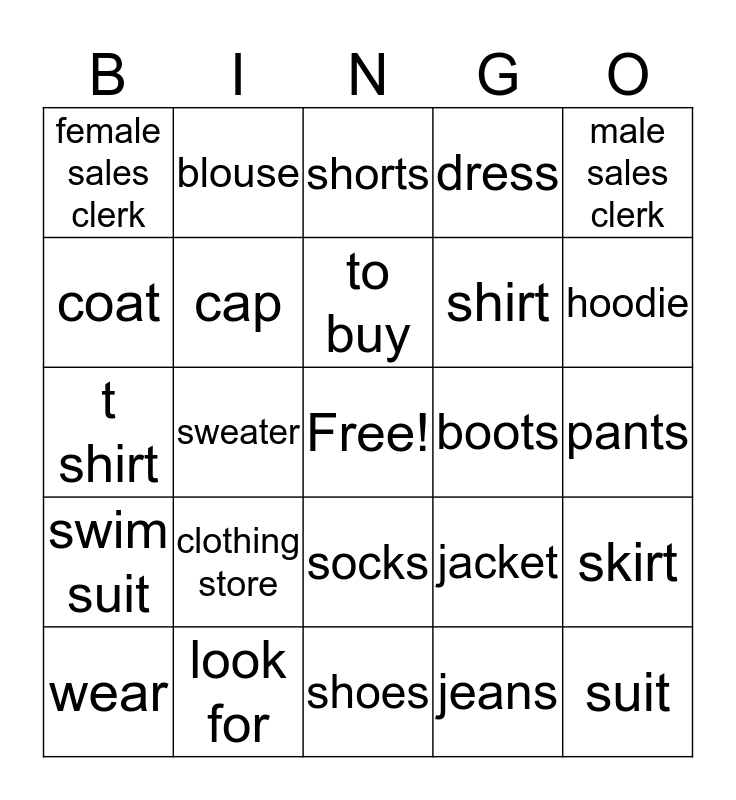 This bingo card has a free space and 24 words: clothing store, look for, to buy, wear, male sales clerk, female sales clerk, coat, blouse, boots, socks, shirt, t shirt, jacket, skirt, cap, jeans, pants, shorts, hoodie, sweater, suit, swim suit, dress and shoes.