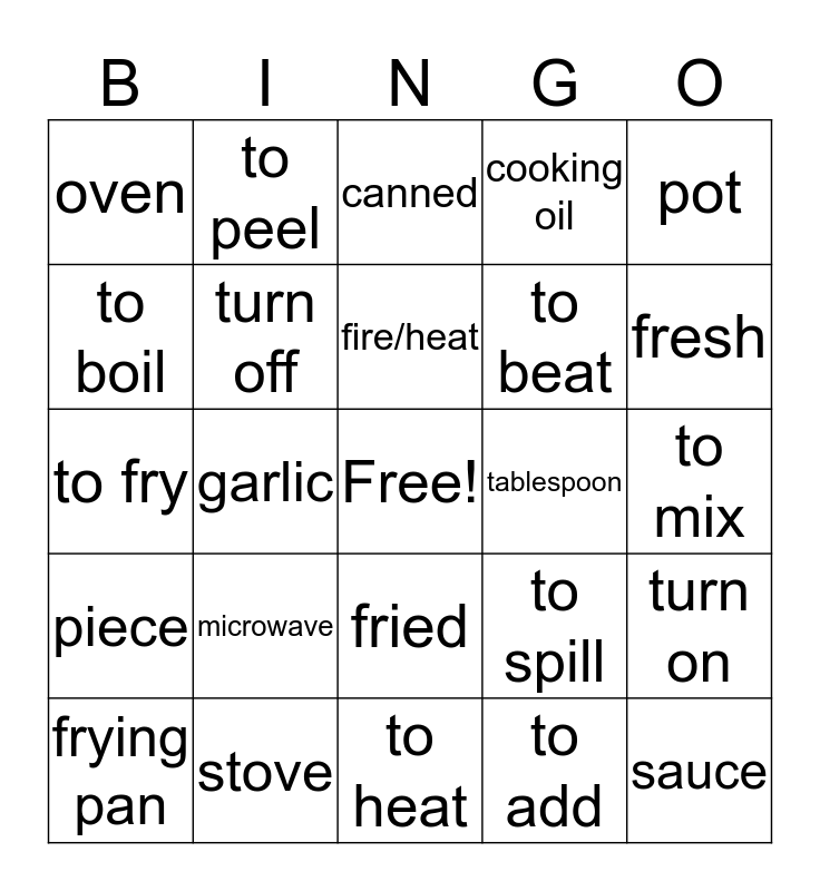 This bingo card has a free space and 24 words: microwave, stove, fire/heat, frying pan, pot, oven, to boil, to peel, tablespoon, fried, to beat, to fry, to spill, turn on, turn off, to add, to mix, canned, fresh, garlic, sauce, piece, cooking oil and to heat.
