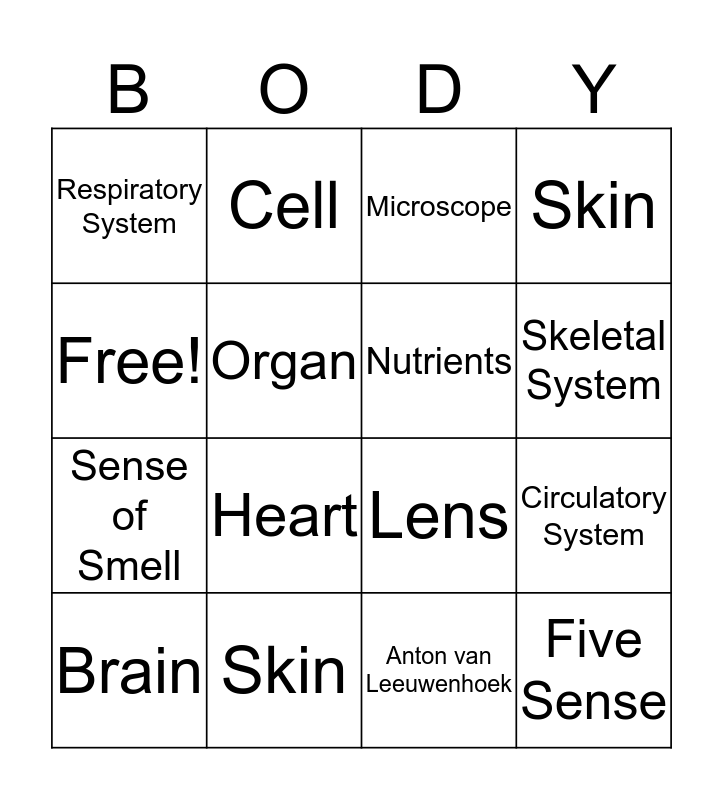 This bingo card has 16 words: Skin, Circulatory System, Microscope, Respiratory System, Sense of Smell, Cell, Lens, Anton van Leeuwenhoek, Free!, Organ, Brain, Skin, Heart, Skeletal System, Nutrients and Five Sense.