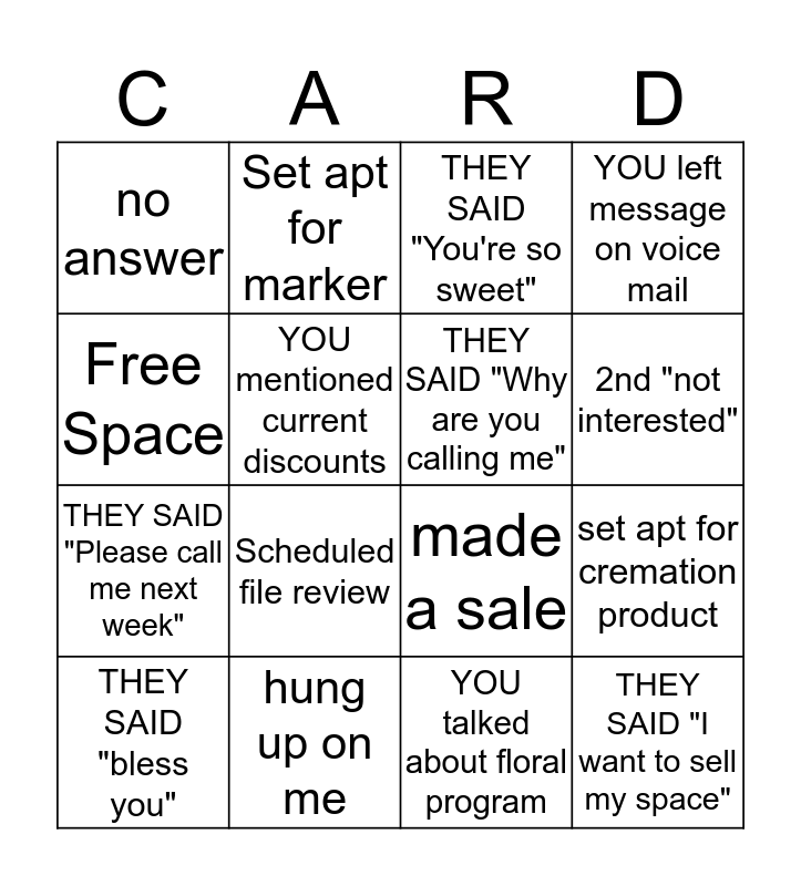 This bingo card has 16 words: hung up on me, set apt for cremation product, THEY SAID "You're so sweet", no answer, THEY SAID "Please call me next week", Set apt for marker, made a sale, YOU talked about floral program, Free Space, YOU mentioned current discounts, THEY SAID "bless you", YOU left message on voice mail, Scheduled file review, 2nd "not interested", THEY SAID "Why are you calling me" and THEY SAID "I want to sell my space".