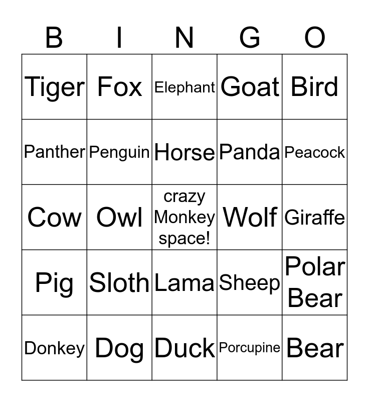 This bingo card has a free space and 24 words: Sloth, Dog, Horse, Donkey, Bird, Tiger, Panther, Fox, Wolf, Lama, Panda, Cow, Sheep, Polar Bear, Penguin, Porcupine, Giraffe, Elephant, Peacock, Owl, Bear, Pig, Goat and Duck.