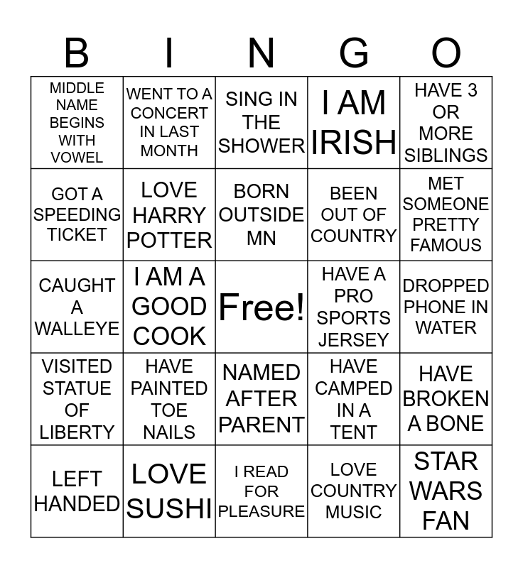 This bingo card has a free space and 24 words: HAVE PAINTED TOE NAILS, LOVE SUSHI, BORN OUTSIDE MN, LEFT HANDED, HAVE 3 OR MORE SIBLINGS, MIDDLE NAME BEGINS WITH VOWEL, GOT A SPEEDING TICKET, WENT TO A CONCERT IN LAST MONTH, HAVE A PRO SPORTS JERSEY, NAMED AFTER PARENT, BEEN OUT OF COUNTRY, CAUGHT A WALLEYE, HAVE CAMPED IN A TENT, HAVE BROKEN A BONE, LOVE HARRY POTTER, LOVE COUNTRY MUSIC, DROPPED PHONE IN WATER, SING IN THE SHOWER, MET SOMEONE PRETTY FAMOUS, I AM A GOOD COOK, STAR WARS FAN, VISITED STATUE OF LIBERTY, I AM IRISH and I READ FOR PLEASURE.