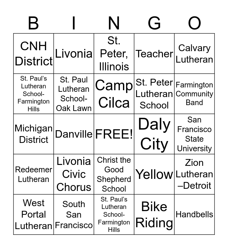 This bingo card has a free space and 24 words: Livonia Civic Chorus, South San Francisco, Camp Cilca, West Portal Lutheran, Calvary Lutheran, CNH District, St. Paul’s Lutheran School-Farmington Hills, Livonia, Daly City, Christ the Good Shepherd School, St. Peter Lutheran School, Michigan District, Yellow, Zion Lutheran –Detroit, St. Paul Lutheran School-Oak Lawn, Bike Riding, San Francisco State University, St. Peter, Illinois, Farmington Community Band, Danville, Handbells, Redeemer Lutheran, Teacher and St. Paul’s Lutheran School-Farmington Hills.