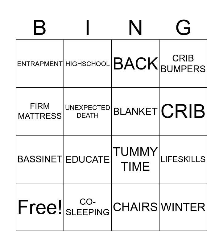 This bingo card has 27 words: Free!, FIRST FAMILY, UNEXPECTED DEATH, PORTABLE PLAYYARD, CRIB BUMPERS, ENTRAPMENT, HIGHSCHOOL, CHAIRS, LIFESKILLS, SMOKING, CO-SLEEPING, BLANKET, CAR SEAT, PILLOWS, EDUCATE, PACIFIER, CRIB, BASSINET, BABY, BACK, WINTER, FALL, VACCINATIONS, TUMMY TIME, ROOM TEMP, FIRM MATTRESS and SIDS.