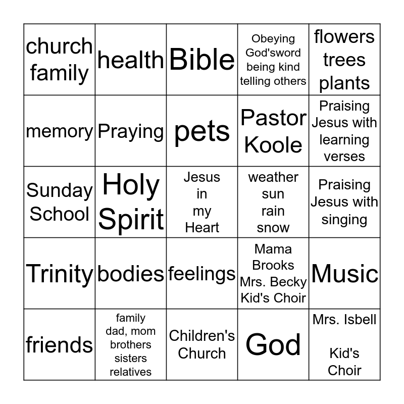 This bingo card has a free space and 24 words: bodies, family dad, mom brothers sisters relatives, pets, friends, flowers trees plants, church family, memory, health, weather sun rain snow, feelings, Pastor Koole, Sunday School, Mama Brooks Mrs. Becky Kid's Choir, Music, Praying, God, Praising Jesus with singing, Bible, Praising Jesus with learning verses, Holy Spirit, Mrs. Isbell Kid's Choir, Trinity, Obeying God'sword being kind telling others and Children's Church.