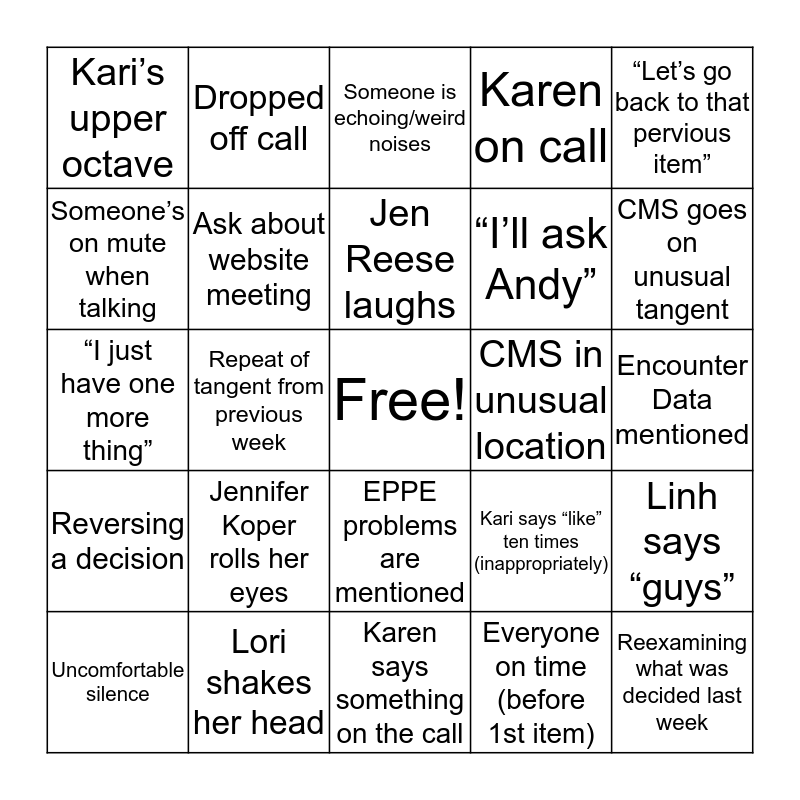 This bingo card has a free space and 24 words: Jennifer Koper rolls her eyes, Lori shakes her head, Jen Reese laughs, Uncomfortable silence, “Let’s go back to that pervious item”, Kari’s upper octave, Someone’s on mute when talking, Dropped off call, CMS in unusual location, EPPE problems are mentioned, “I’ll ask Andy”, “I just have one more thing”, Kari says “like” ten times (inappropriately), Linh says “guys”, Ask about website meeting, Everyone on time (before 1st item), Encounter Data mentioned, Someone is echoing/weird noises, CMS goes on unusual tangent, Repeat of tangent from previous week, Reexamining what was decided last week, Reversing a decision, Karen on call and Karen says something on the call.