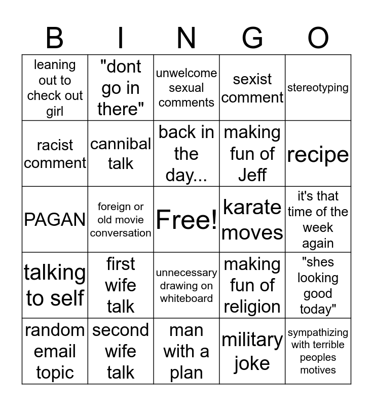 This bingo card has a free space and 24 words: first wife talk, second wife talk, back in the day..., random email topic, stereotyping, leaning out to check out girl, racist comment, "dont go in there", karate moves, unnecessary drawing on whiteboard, making fun of Jeff, PAGAN, making fun of religion, "shes looking good today", cannibal talk, military joke, it's that time of the week again, unwelcome sexual comments, recipe, foreign or old movie conversation, sympathizing with terrible peoples motives, talking to self, sexist comment and man with a plan.