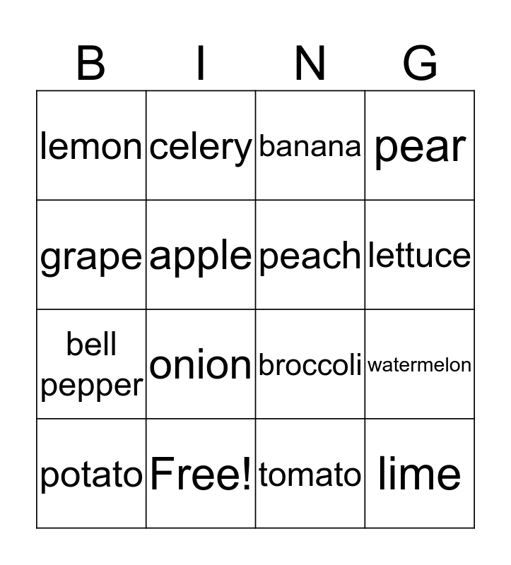 This bingo card has 21 words: Free!, carrot, celery, green beans, tomato, peach, lemon, banana, broccoli, lettuce, bell pepper, pear, lime, strawberry, apple, cherry, potato, onion, grape, watermelon and corn.