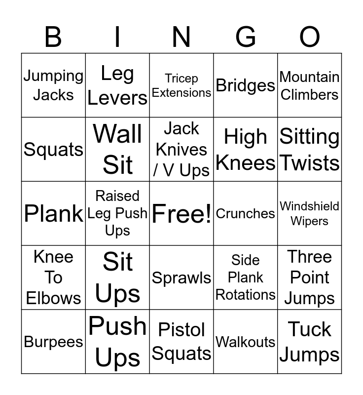 This bingo card has a free space and 24 words: Sit Ups, Push Ups, Jack Knives / V Ups, Burpees, Mountain Climbers, Jumping Jacks, Squats, Leg Levers, Crunches, Sprawls, High Knees, Plank, Side Plank Rotations, Three Point Jumps, Wall Sit, Walkouts, Windshield Wipers, Tricep Extensions, Sitting Twists, Raised Leg Push Ups, Tuck Jumps, Knee To Elbows, Bridges and Pistol Squats.