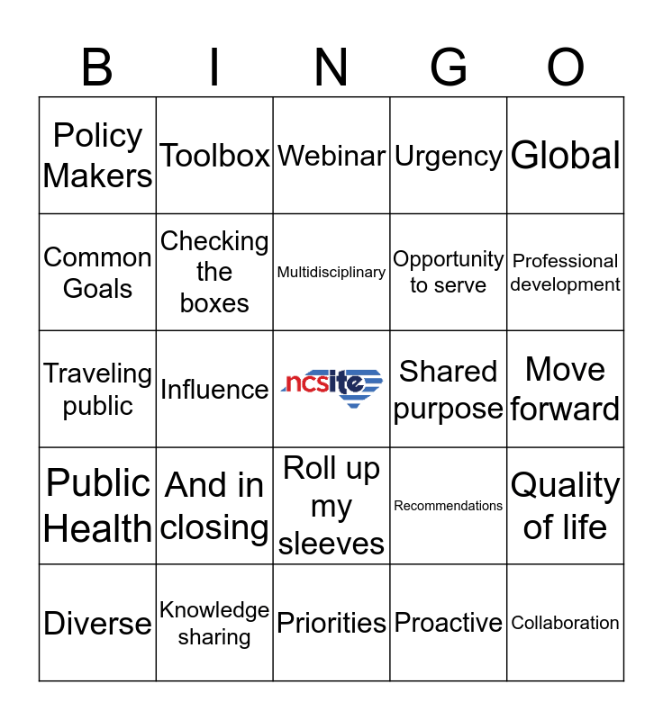 This bingo card has a free space and 24 words: And in closing, Knowledge sharing, Multidisciplinary, Diverse, Global, Policy Makers, Common Goals, Toolbox, Shared purpose, Roll up my sleeves, Opportunity to serve, Traveling public, Recommendations, Quality of life, Checking the boxes, Proactive, Move forward, Webinar, Professional development, Influence, Collaboration, Public Health, Urgency and Priorities.