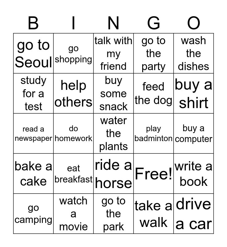 This bingo card has 25 words: eat breakfast, go to the park, buy some snack, go camping, wash the dishes, go to Seoul, study for a test, go shopping, play badminton, ride a horse, feed the dog, read a newspaper, Free!, write a book, help others, drive a car, buy a computer, talk with my friend, buy a shirt, do homework, water the plants, watch a movie, bake a cake, go to the party and take a walk.