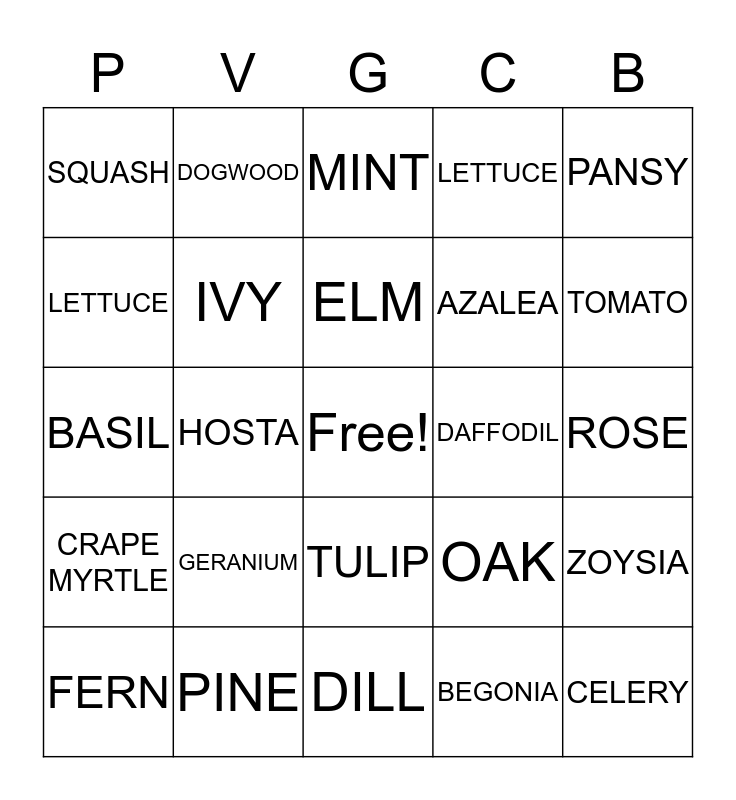This bingo card has a free space and 24 words: GERANIUM, PINE, ELM, FERN, PANSY, SQUASH, LETTUCE, DOGWOOD, DAFFODIL, TULIP, AZALEA, BASIL, OAK, ZOYSIA, IVY, BEGONIA, ROSE, MINT, TOMATO, HOSTA, CELERY, CRAPE MYRTLE, LETTUCE and DILL.