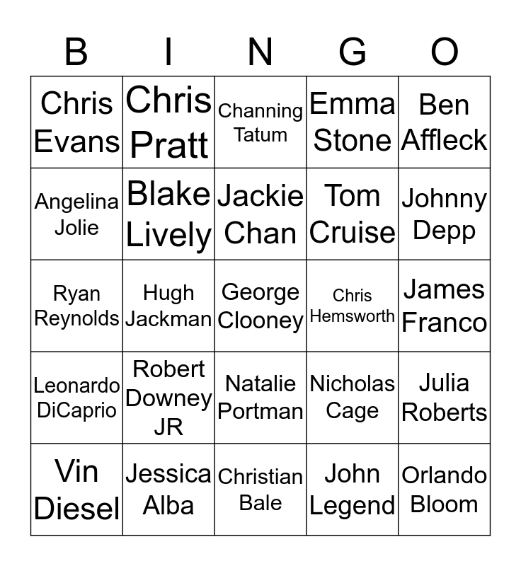 This bingo card has a free space and 24 words: Robert Downey JR, Jessica Alba, Jackie Chan, Vin Diesel, Ben Affleck, Chris Evans, Angelina Jolie, Chris Pratt, Chris Hemsworth, Natalie Portman, Tom Cruise, Ryan Reynolds, Nicholas Cage, Julia Roberts, Blake Lively, John Legend, James Franco, Channing Tatum, Johnny Depp, Hugh Jackman, Orlando Bloom, Leonardo DiCaprio, Emma Stone and Christian Bale.