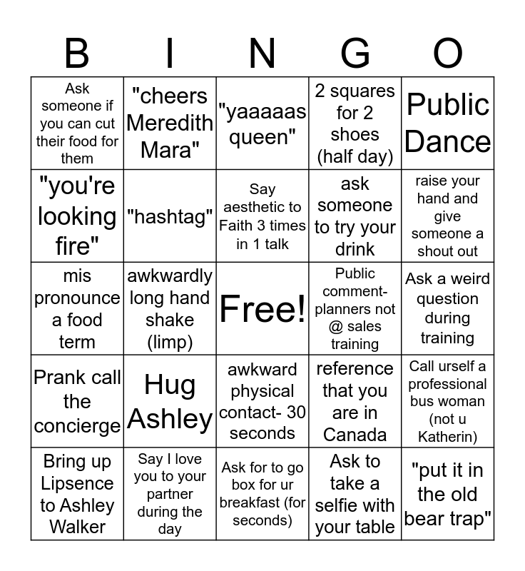 This bingo card has a free space and 24 words: Hug Ashley, Say I love you to your partner during the day, Say aesthetic to Faith 3 times in 1 talk, Bring up Lipsence to Ashley Walker, Public Dance, Ask someone if you can cut their food for them, "you're looking fire", "cheers Meredith Mara", Public comment- planners not @ sales training, awkward physical contact- 30 seconds, ask someone to try your drink, mis pronounce a food term, reference that you are in Canada, Call urself a professional bus woman (not u Katherin), "hashtag", Ask to take a selfie with your table, Ask a weird question during training, "yaaaaas queen", raise your hand and give someone a shout out, awkwardly long hand shake (limp), "put it in the old bear trap", Prank call the concierge, 2 squares for 2 shoes (half day) and Ask for to go box for ur breakfast (for seconds).