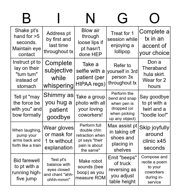 This bingo card has a free space and 24 words: Wear gloves or mask for 1 tx without explanation, Test pt's balance with eyes closed and chant "ahh-ohhh-mmm", Take a selfie with a patient (per HIPAA regs), Bid farewell to pt with a running high-five jump, Complete a tx in an accent of your choice, Shake pt's hand for >5 seconds. Maintain eye contact, Instruct pt to lay on their "tum tum" instead of stomach, Address pt by first and last time throughout tx, Perform the bend and snap when pen is dropped (or when picking up any object), Perform full double chin retraction when pt says "their pain is about the same", Refer to yourself in 3rd person 3x throughout tx, Tell pt "may the force be with you" and bow formally, Max assist pt in taking off shoes and placing in shelves, Skip joyfully around clinic x45 seconds, Complete subjective while whispering, Emit "beeps" of truck reversing as you adjust table height, Say goodbye to pt with a twirl and a "toodle loo!", Blow air through loose lips if pt hasn't done HEP, Don a Theraband hula skirt. Wear for 2 hours, Shimmy as you hug a patient goodbye, Compose and recite a poem to your coworkers during in-service, When laughing, pump your arms back and forth like a train, Treat for 1 session while enjoying a lollipop and Make robot sounds (bee boop) as you measure ROM.