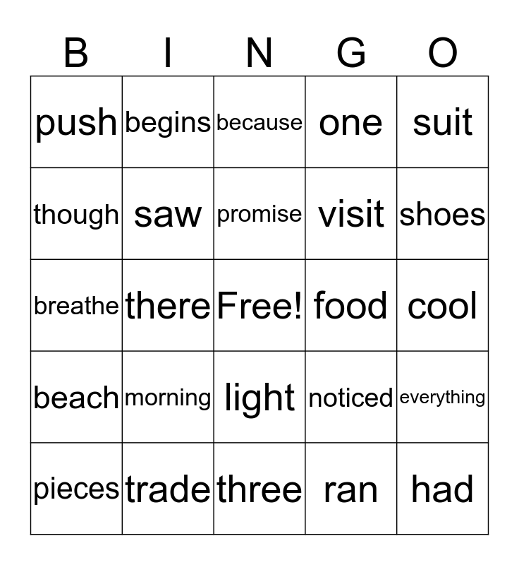 This bingo card has a free space and 24 words: morning, trade, promise, pieces, suit, push, though, begins, food, light, visit, breathe, noticed, everything, saw, ran, cool, because, shoes, there, had, beach, one and three.